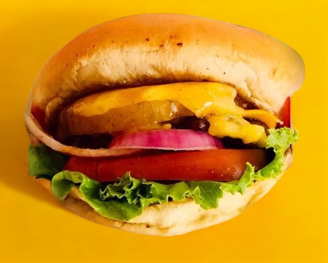 Pan artesanal + carne casera + queso manchego + piña asada + salsa bbq + lechuga + tomate + cebolla morada + papas fritas.