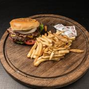 Hamburguesa clasica Smash,queso amarillo 100% leche, aderezo, tomate,lechuga,cebolla, incluye papas a la francesa.