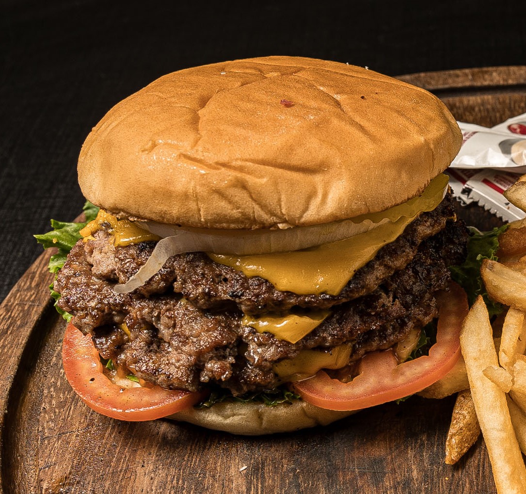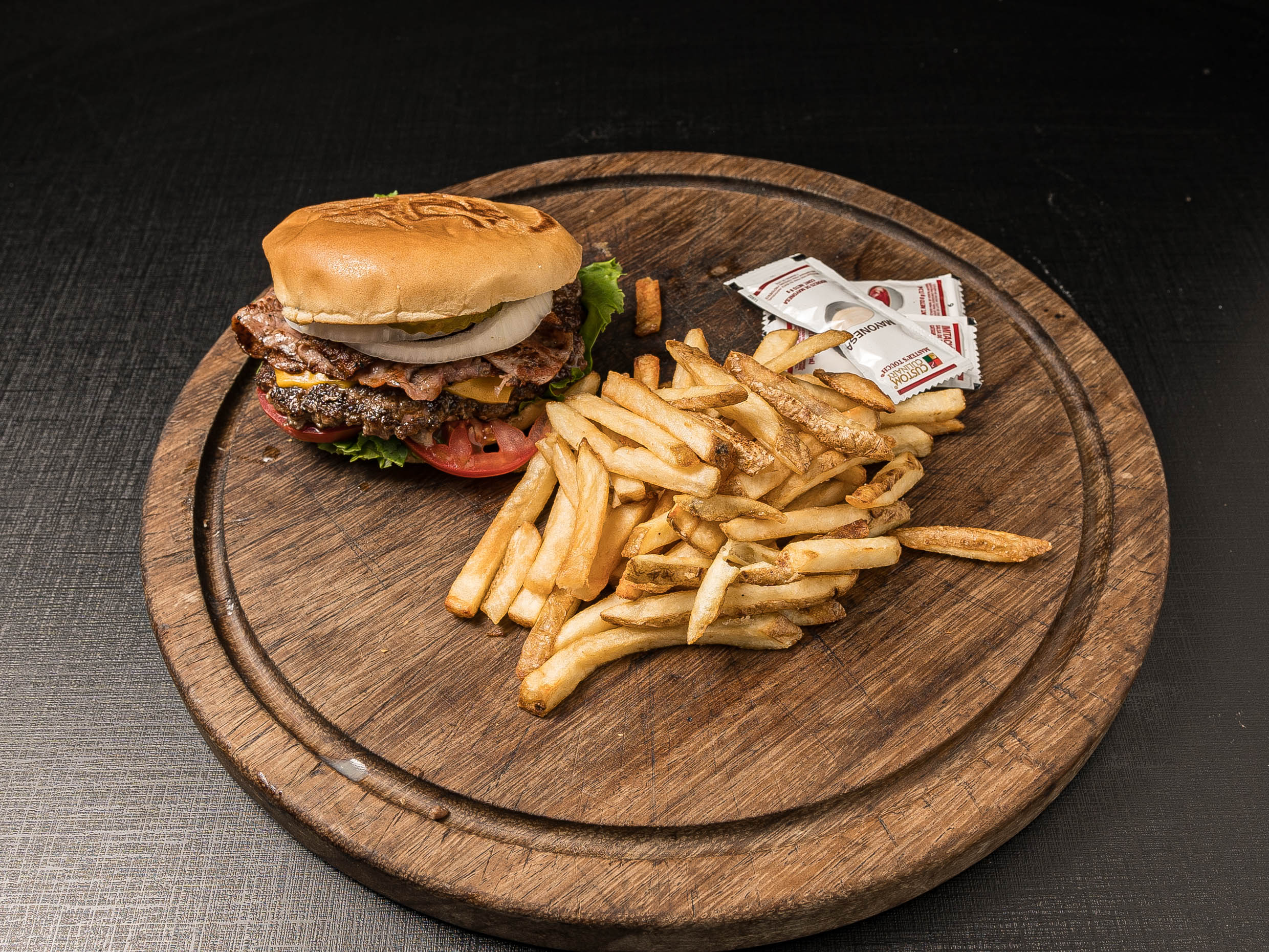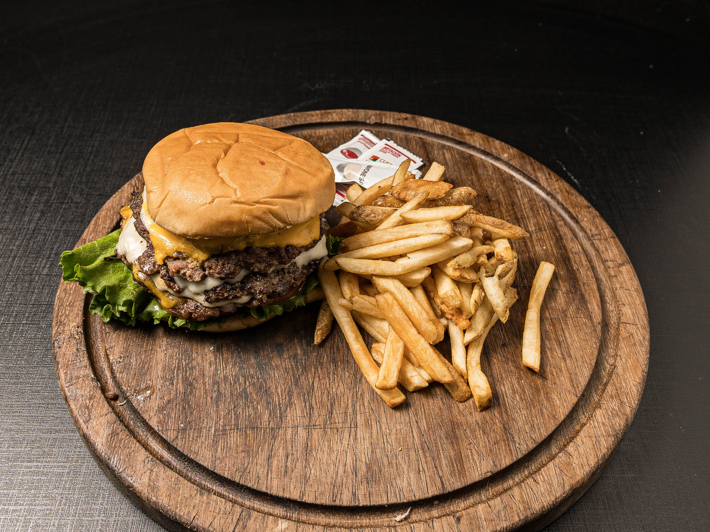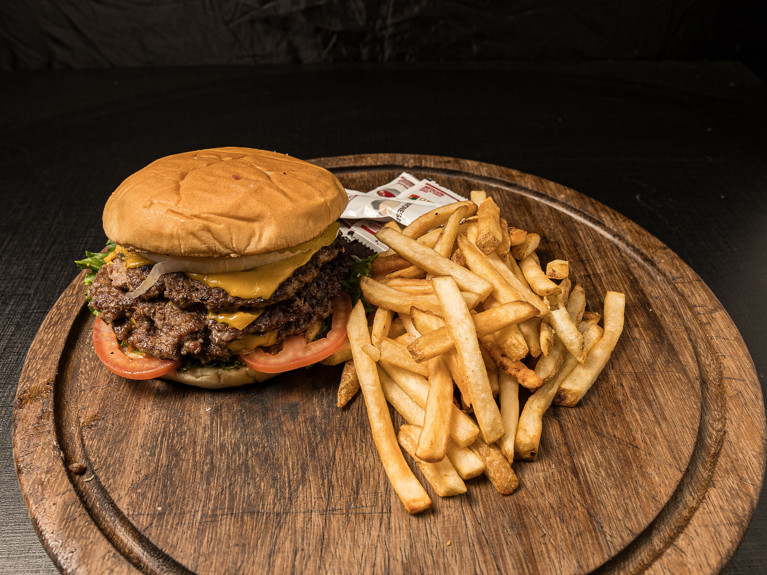 Hamburguesa clasica con doble carne, doble queso amarillo 100% leche, aderezo, tomate,lechuga,cebolla, incluye papas a la francesa. Aderezo ranch.