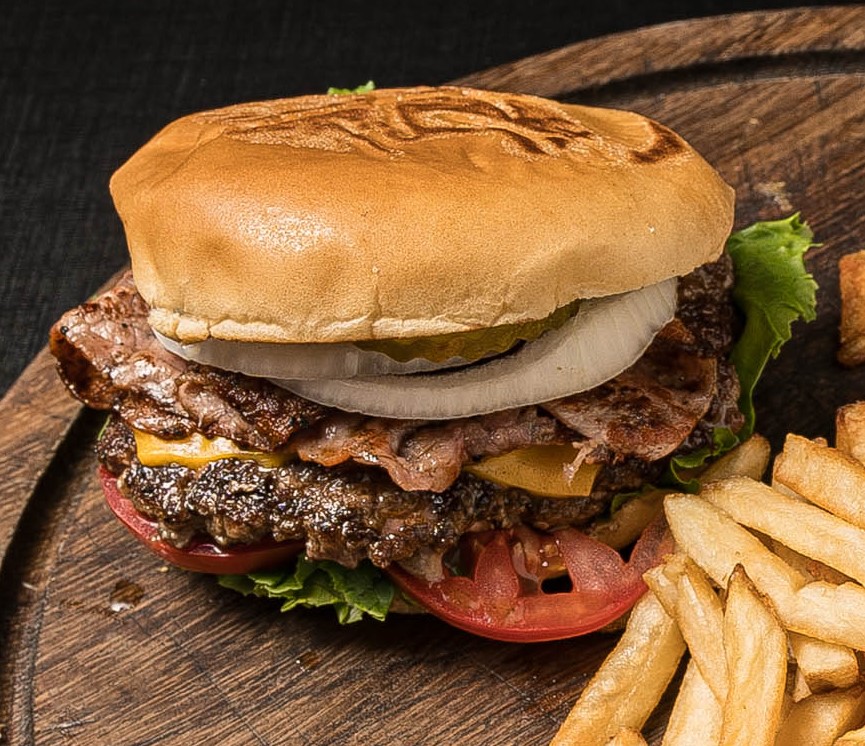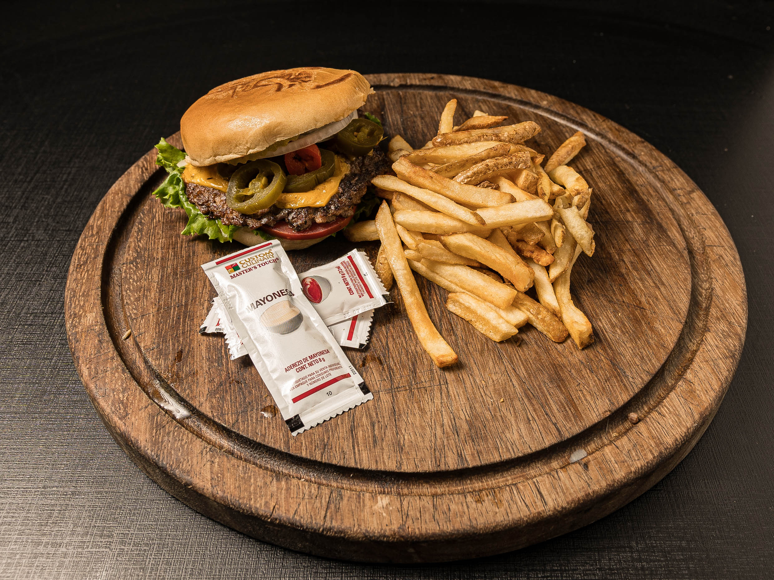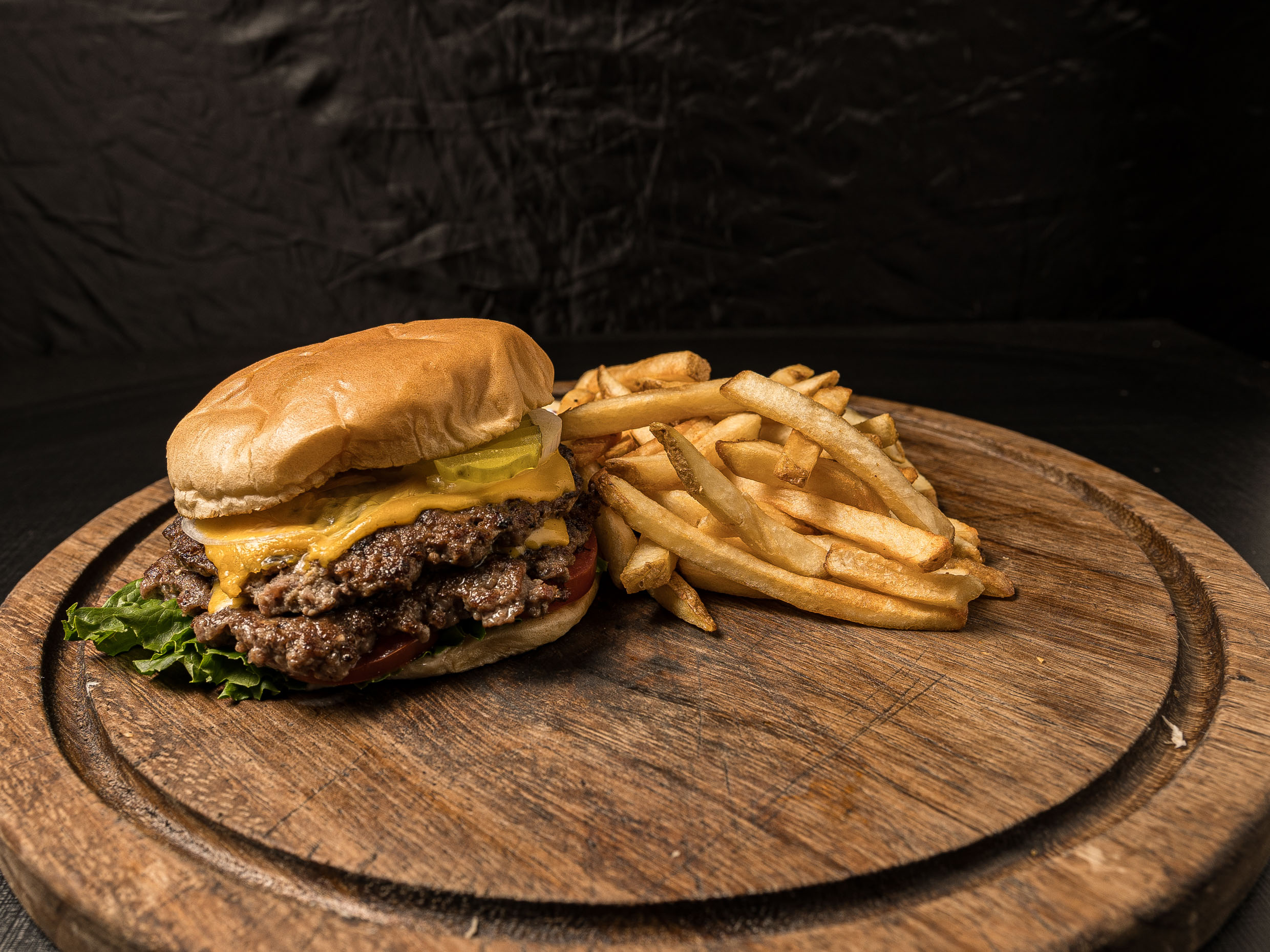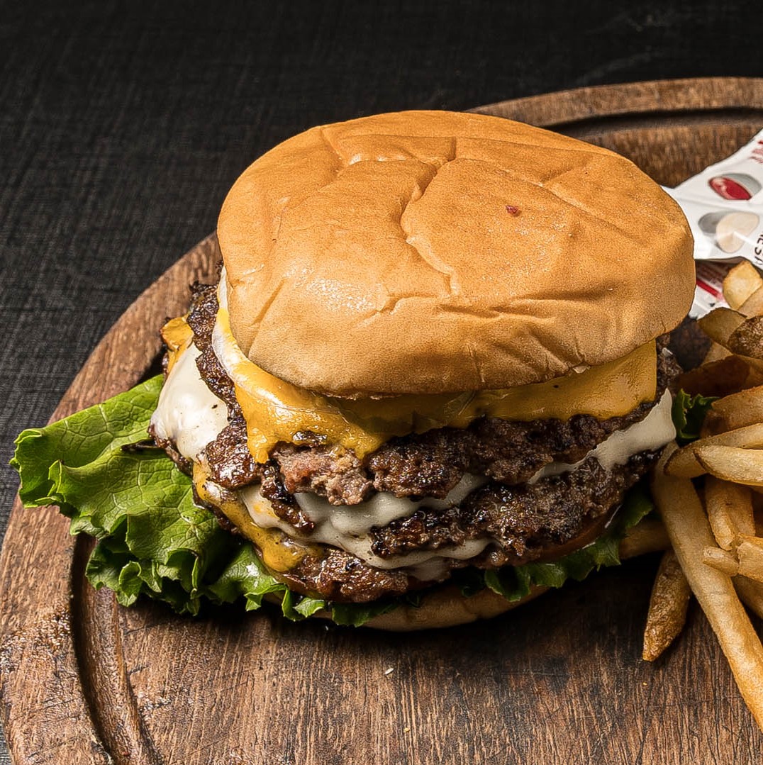 Hamburguesa clasica con doble carne, doble queso amarillo 100% leche, aderezo, tomate,lechuga,cebolla, incluye papas a la francesa. Aderezo ranch.