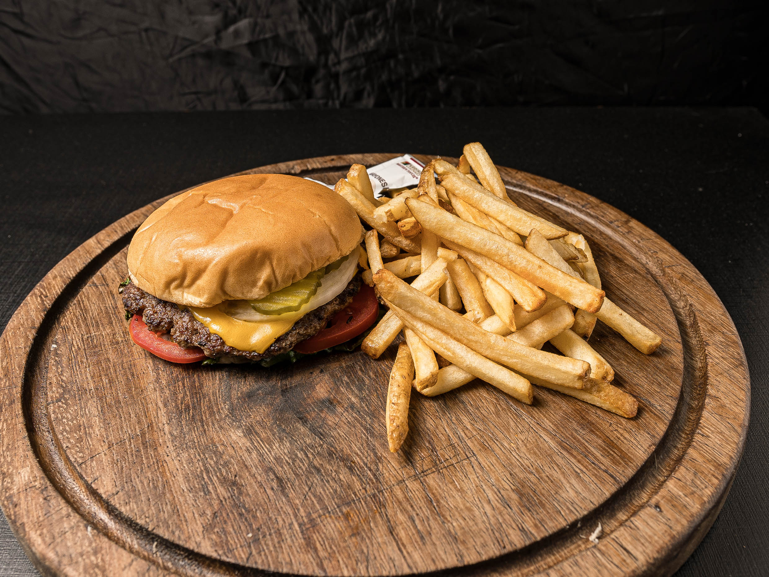 Hamburguesa clasica Smash,queso amarillo 100% leche, aderezo, tomate,lechuga,cebolla, incluye papas a la francesa.