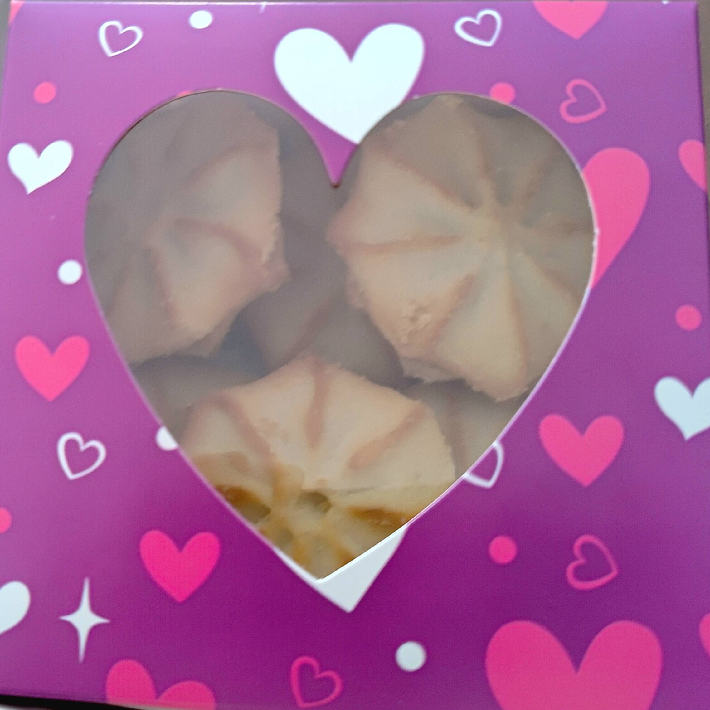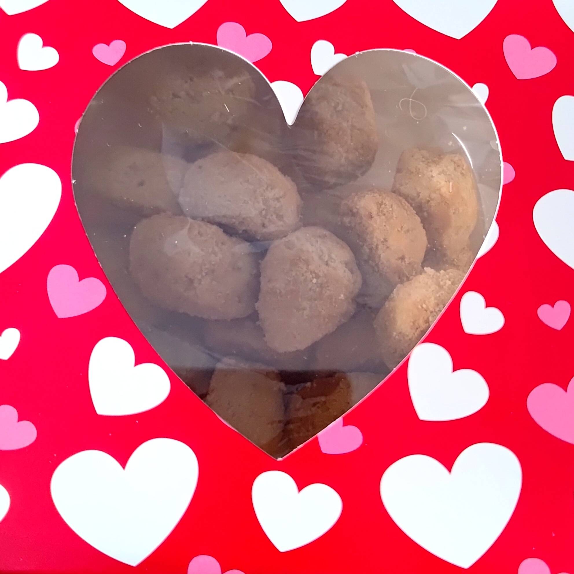 Caja de estilo San Valentín con 20 mini horarazcas clásicas cubiertas con azúcar y canela.