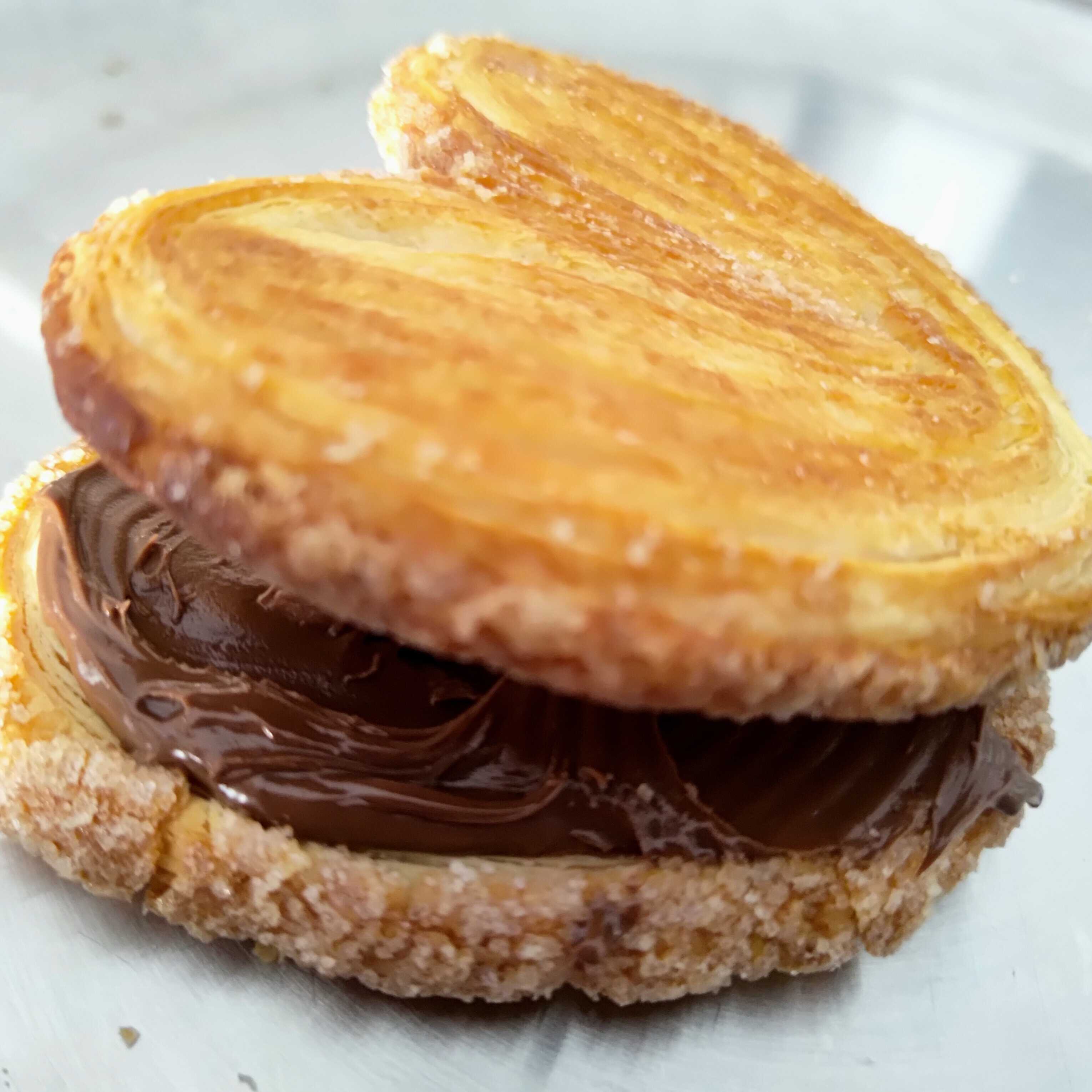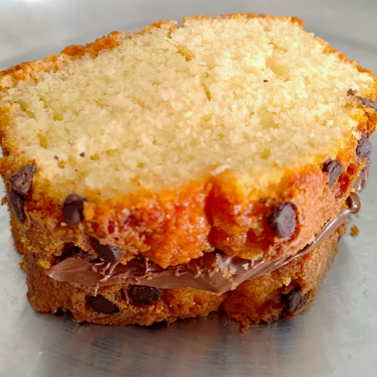 Delicioso y suave sandwich de suave pan de vainilla con chispas de chocolate semiamargo relleno de Nutella original. super delicioso y llenador!