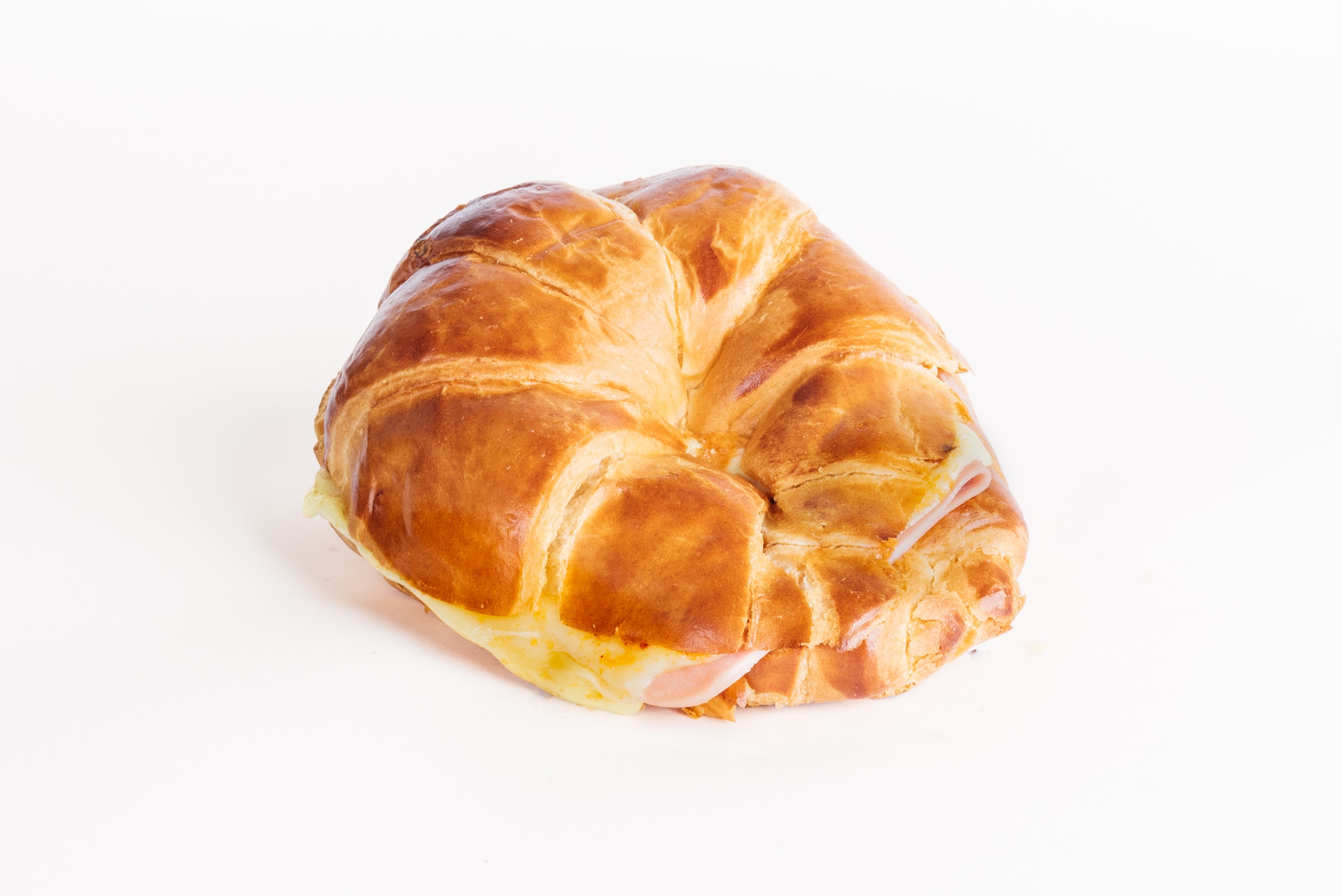 Pan tipo cuernito relleno con jamón de pierna, queso gouda y aderezo de chipotle