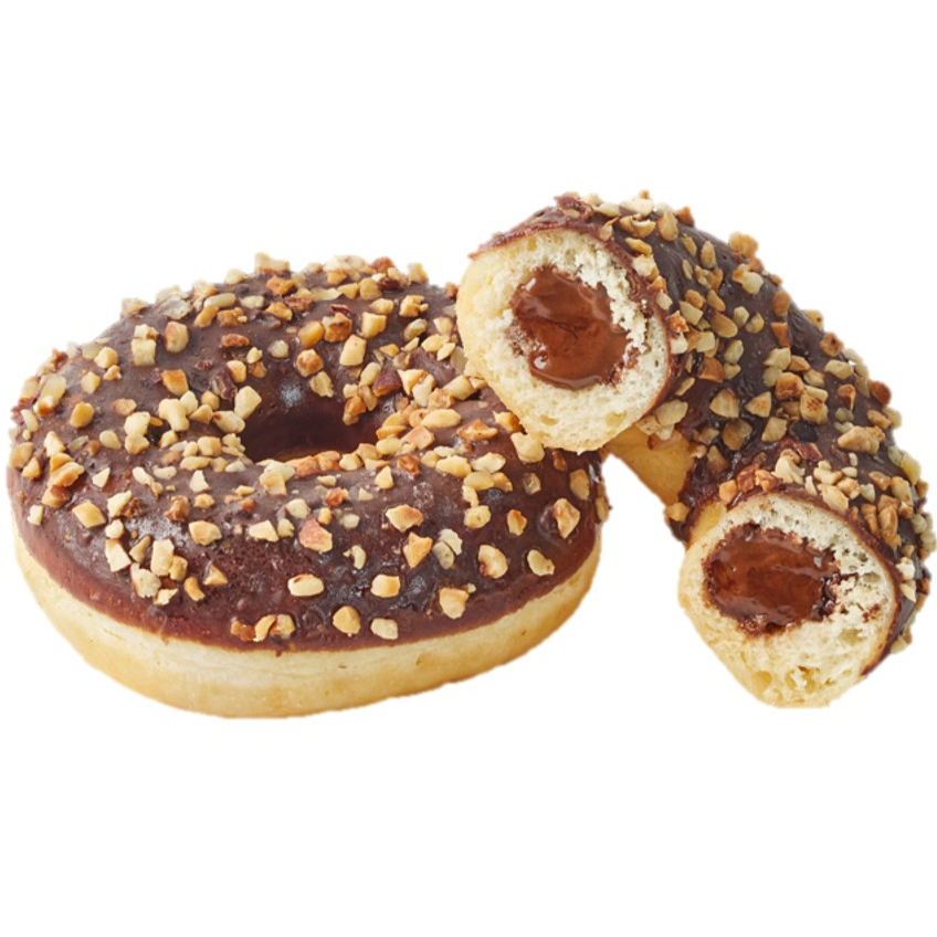 Dona rellena con crema de cacao y avellanas Nocilla®, coronada con trozos crocantes y acabado brillante.