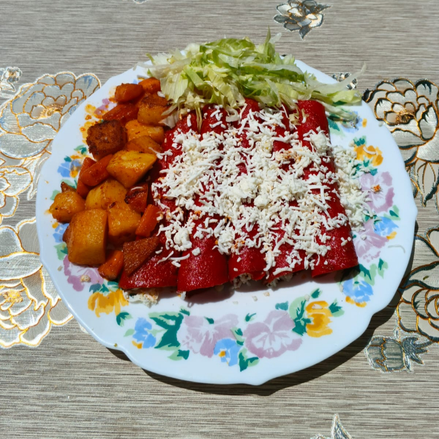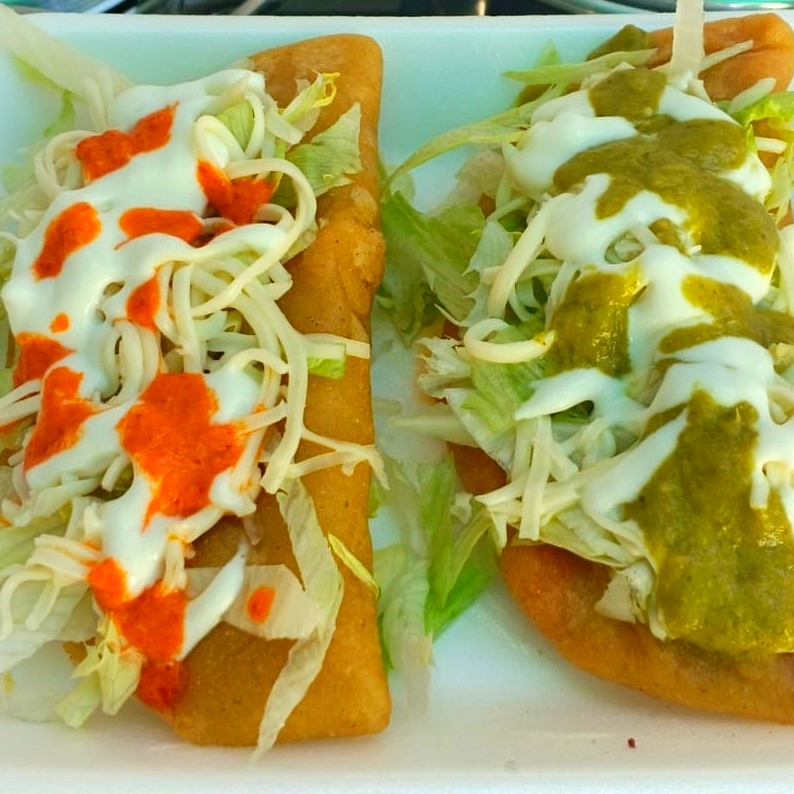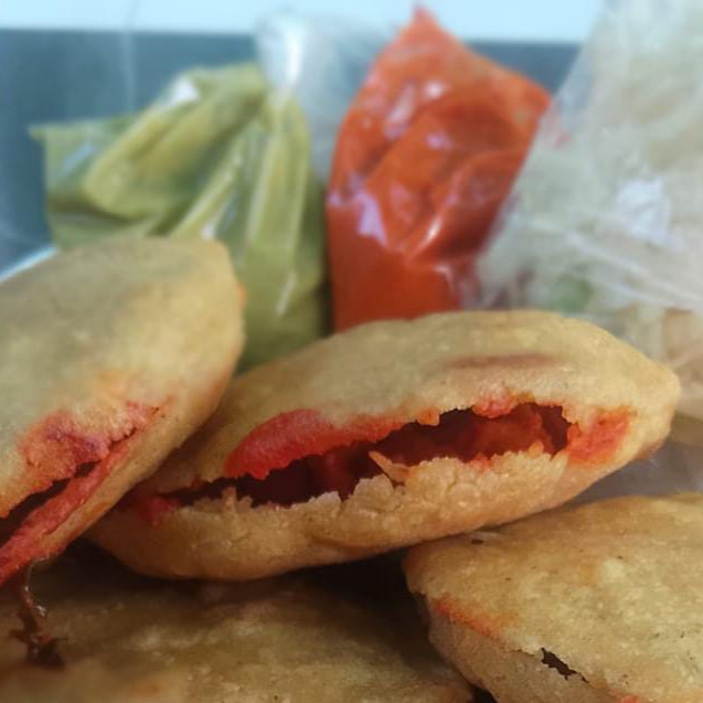 Rica gordita de maíz de guisos con lechuga y salsas (verde y roja).