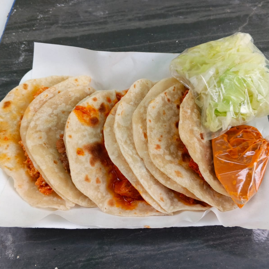 Orden de 5 tacos de harina de guisos a elegir, incluye salsas y lechuga.