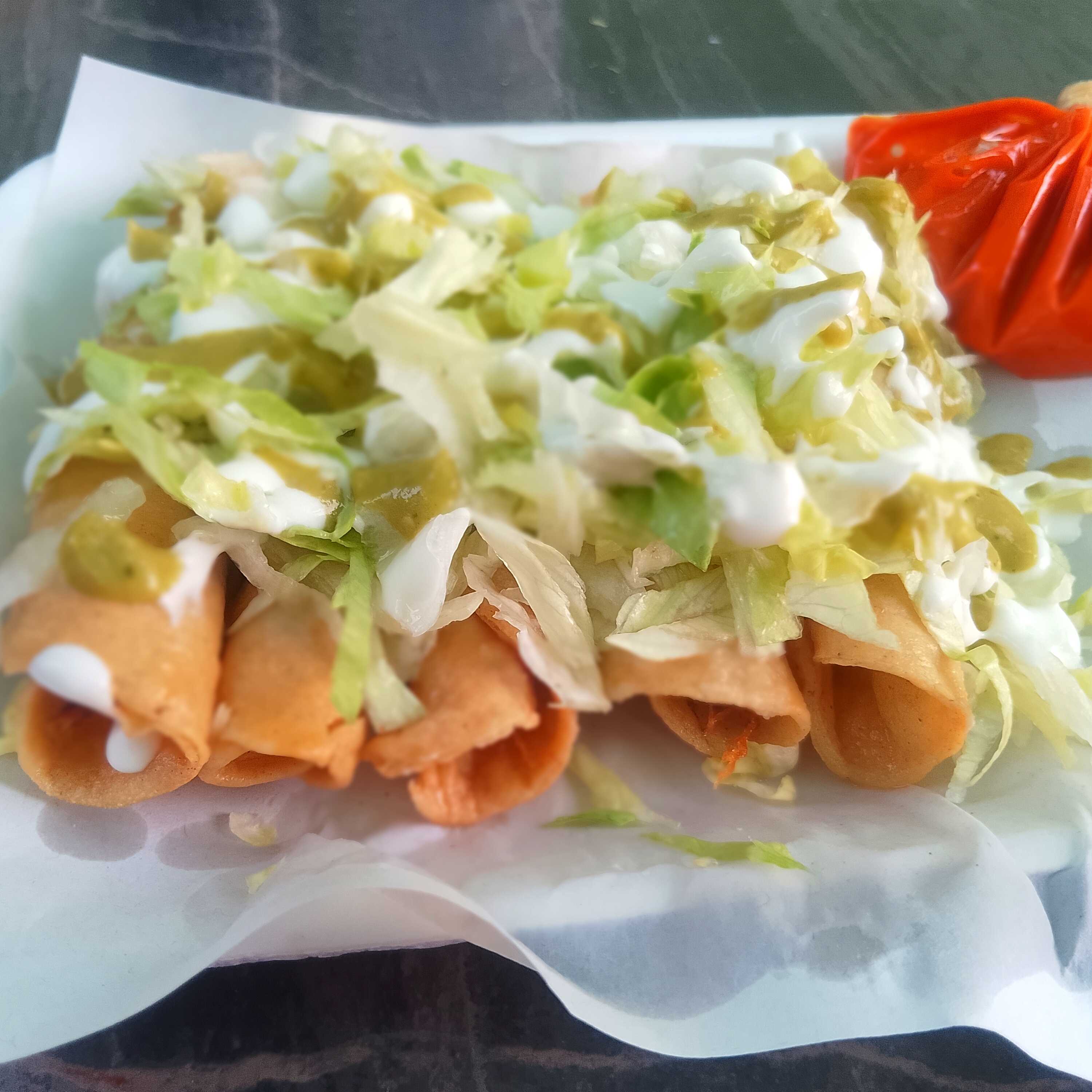 Orden de flautas de deshebrada recién hechas con crema, lechuga, salsas, queso y guacamole.