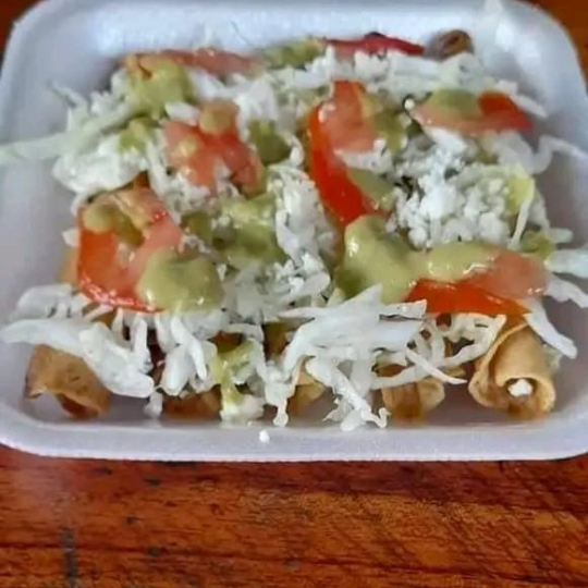 Tacos de pollo fritos hasta alcanzar una textura perfectamente crujiente, acompañados de lechuga, queso y salsa.