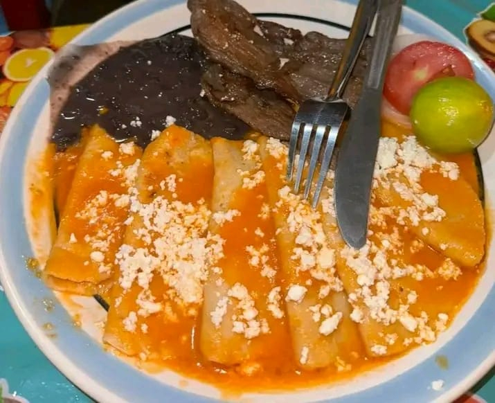 Crujientes totopos bañados en salsa de su elección, servidos con pollo, queso, crema, frijoles refritos y lechuga fresca.