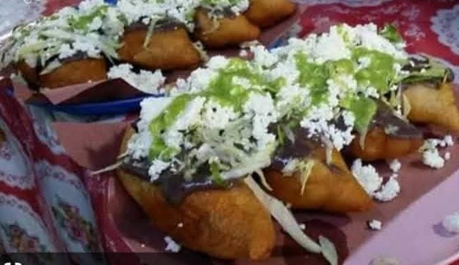 Bocadillos de masa de maíz rellenos de pollo, fritos y servidos con lechuga fresca y queso.