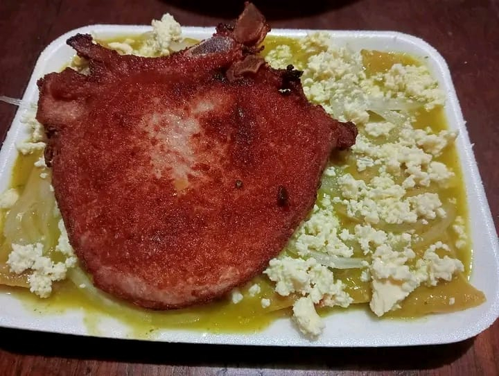 Tradicionales enchiladas en salsa verde con lechuga y queso, acompañadas de una jugosa chuleta de cerdo.