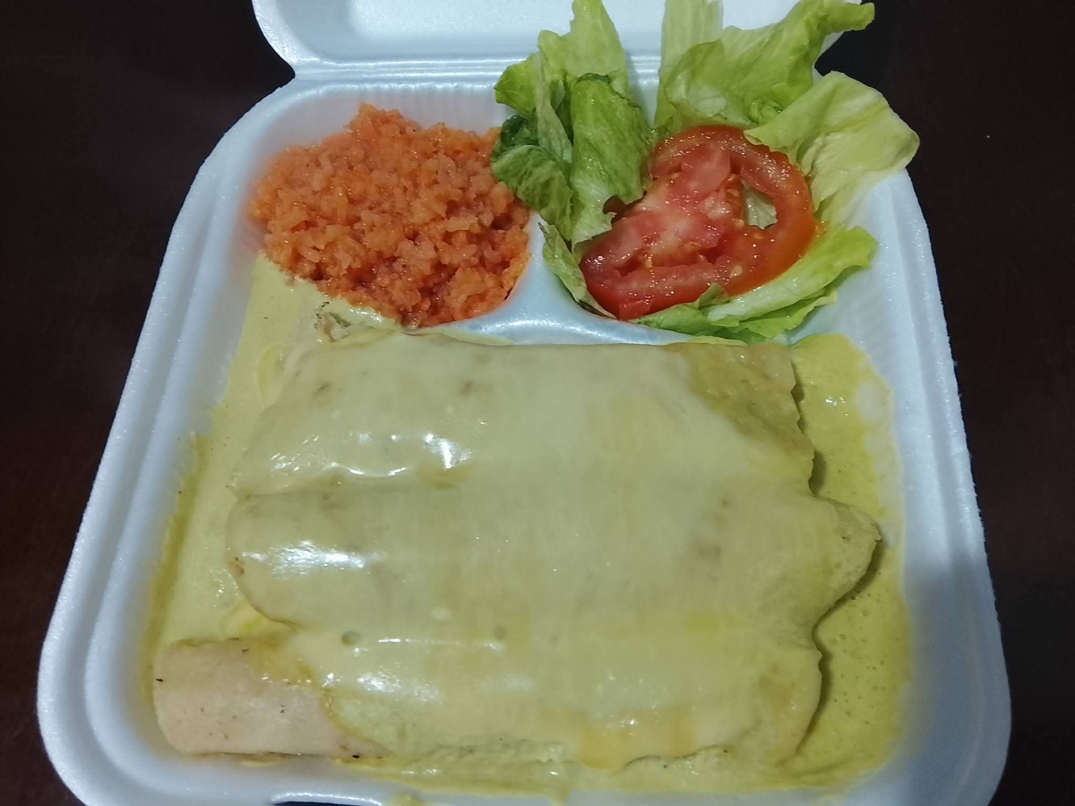 Cinco tortillas rellenas de pollo, bañadas en salsa verde cremosa y gratinadas con queso, acompañadas de crema, lechuga y arroz.