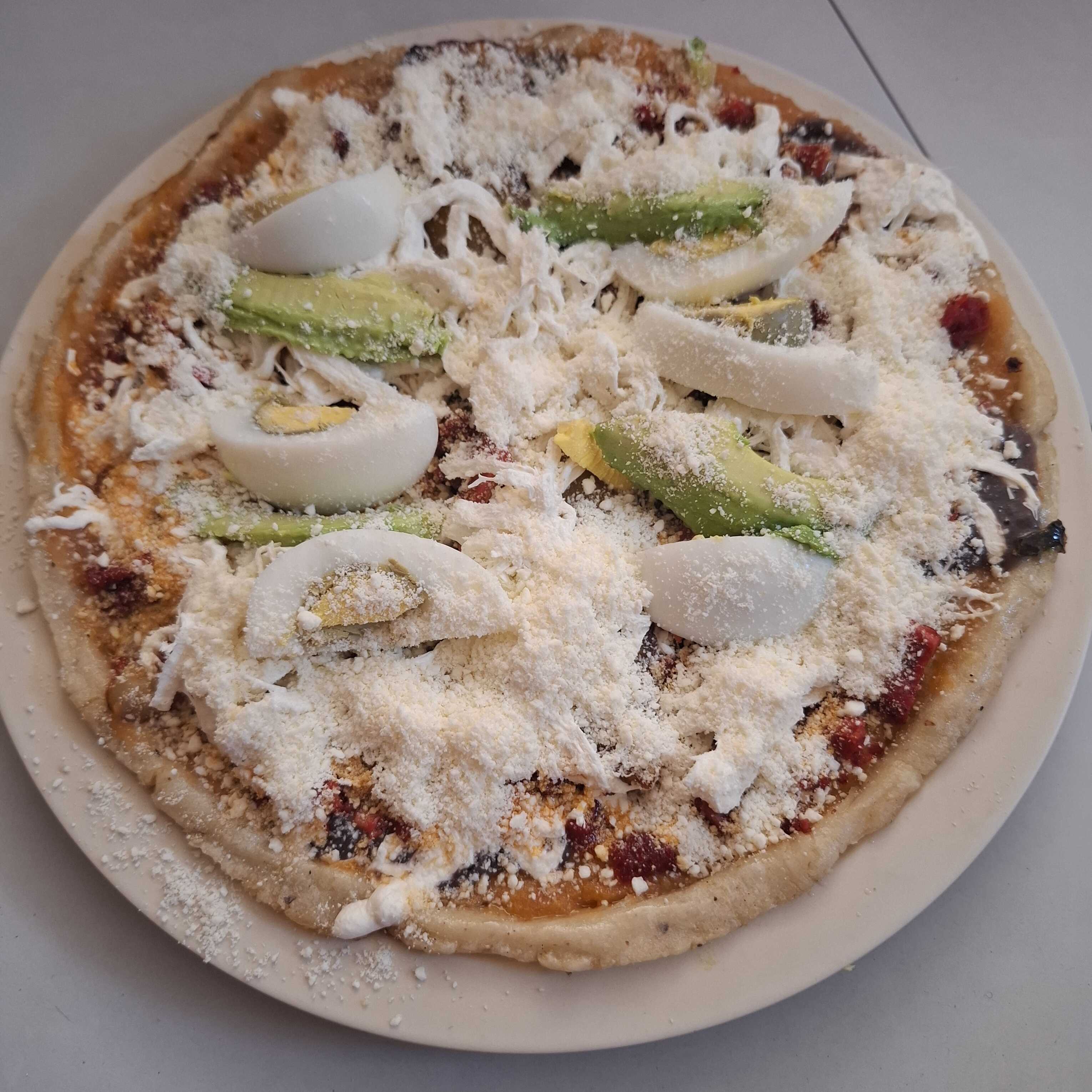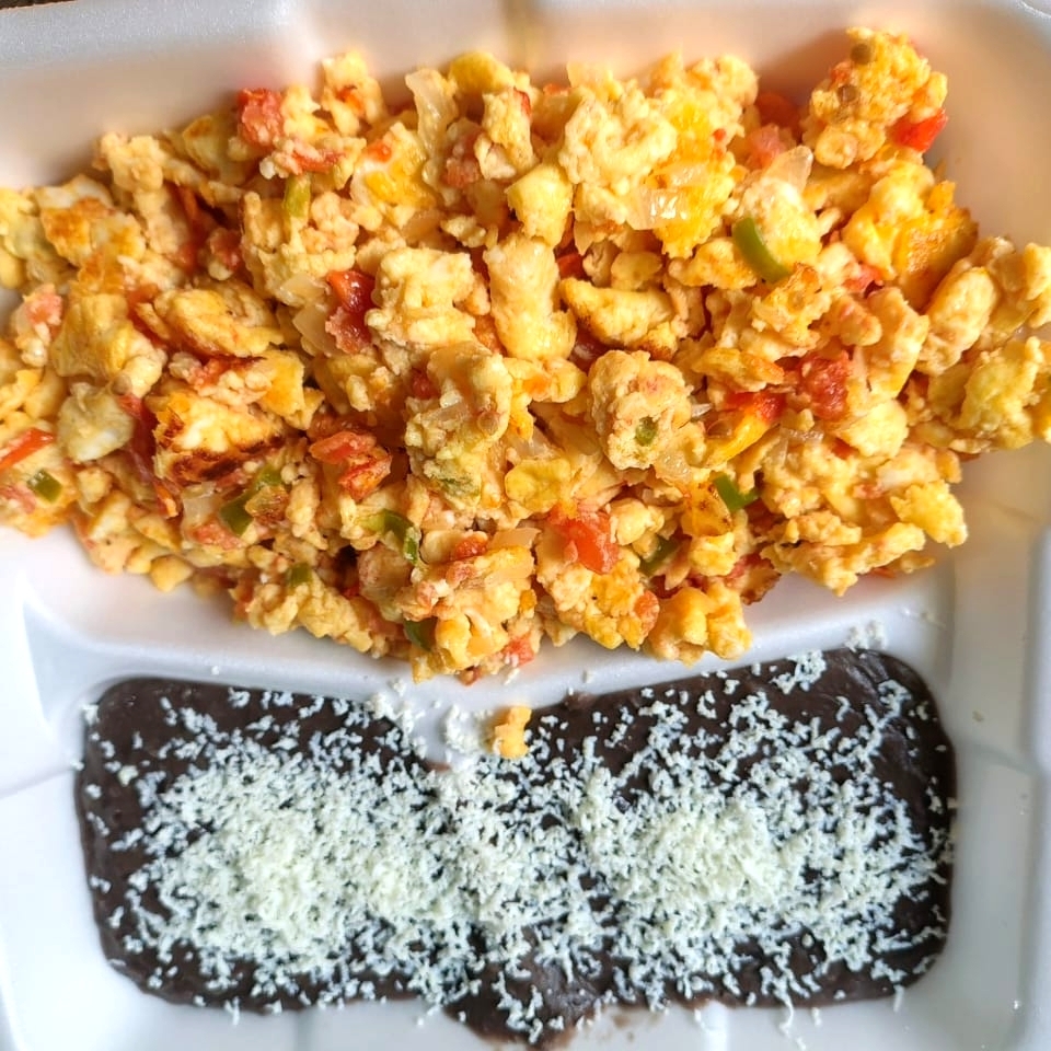 Huevos con salchicha, jamon, chorizo, papa, en salsa, estrellados, a la mexicana compañado con frijoles y 4 tortillas de masa