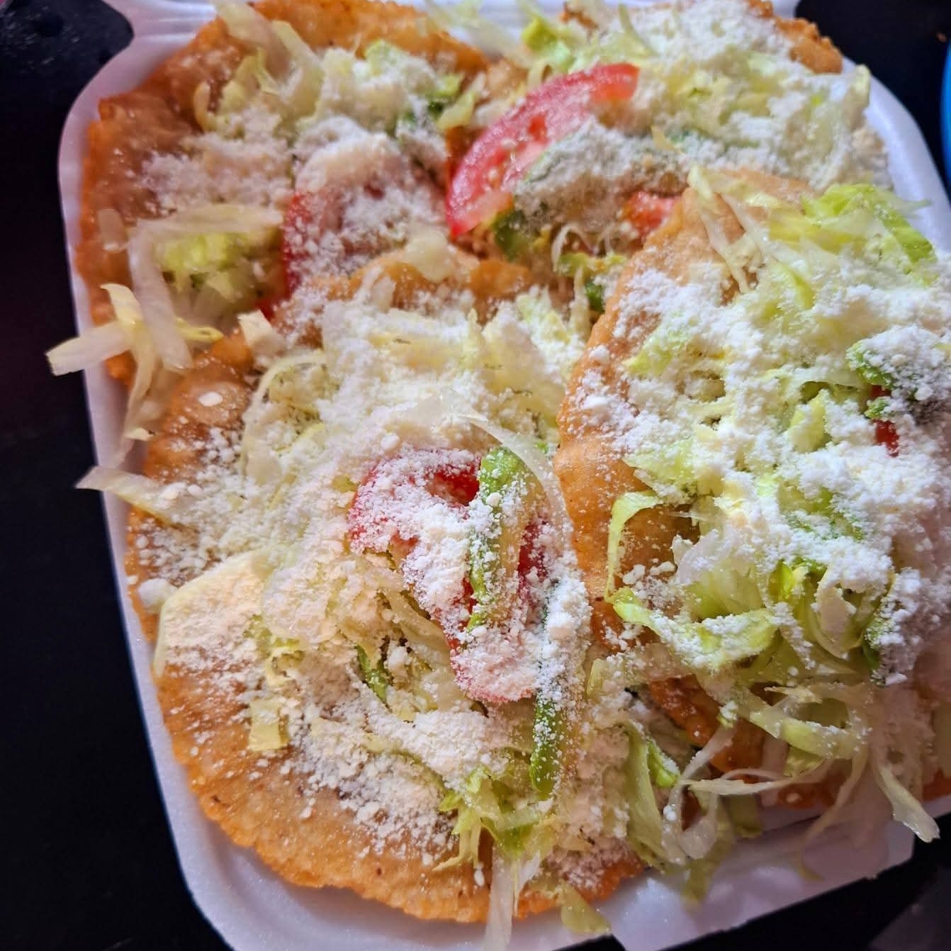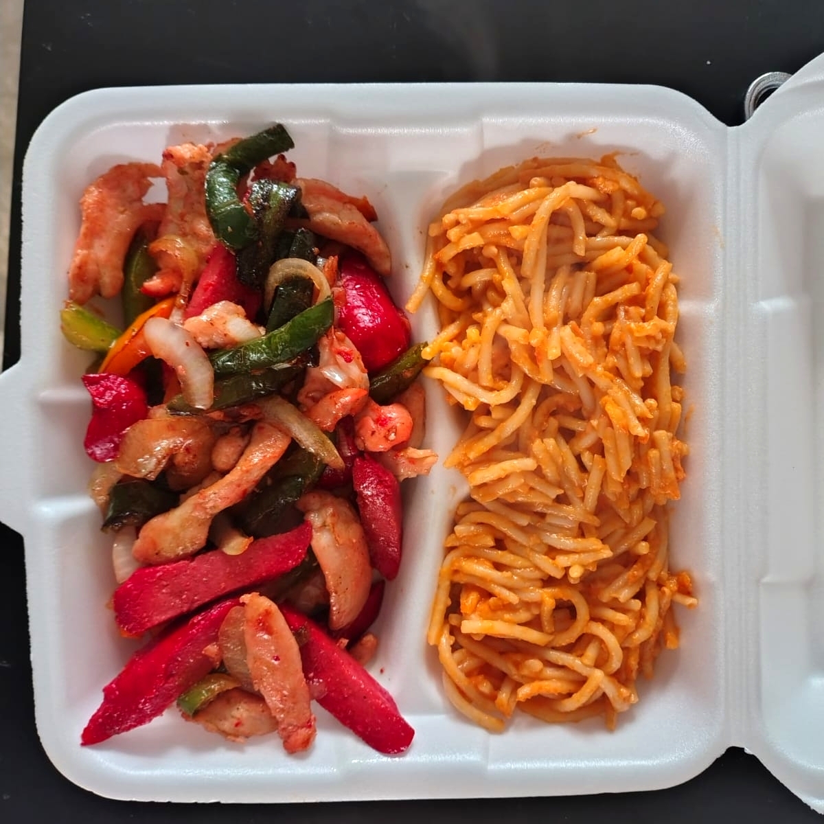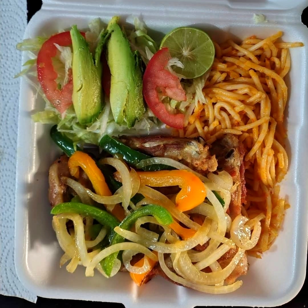 pollo frito con cebolla, chile jalapeño y pimiento verde acompañado con espaguetti y 4 tortillas de masa