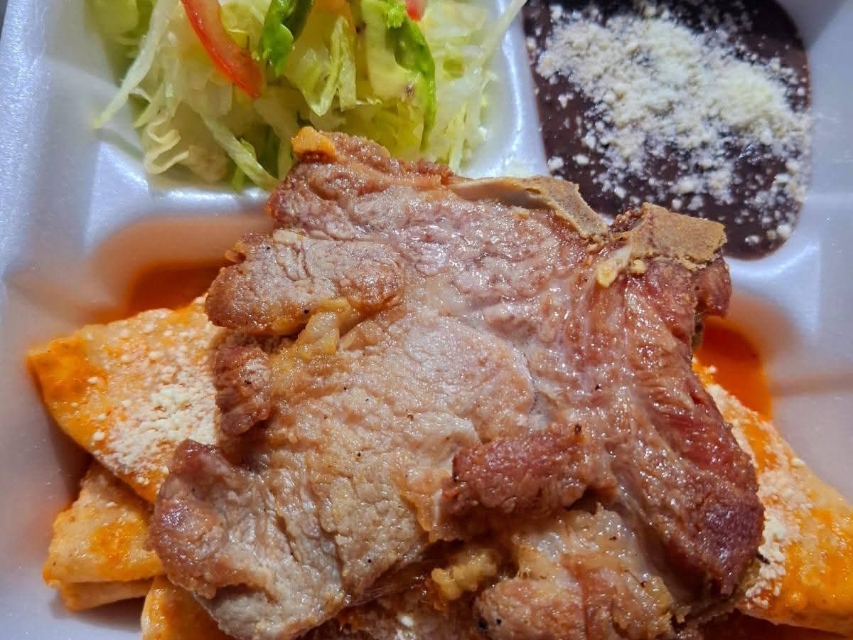 Chuleta frita con salsa de chipotle, acompañada con arroz y 4 tortillas de masa
