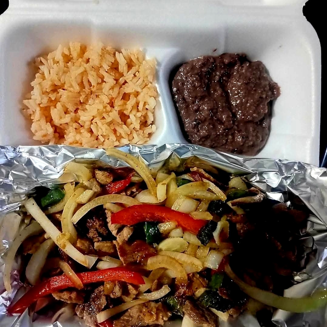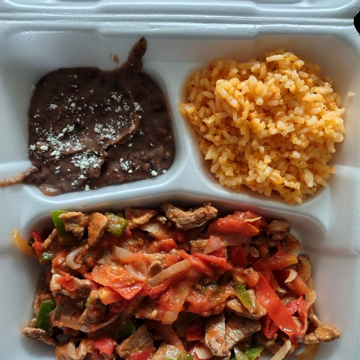 Bisteck de res encebollado, acompañado de arroz y 4 tortillas de masa
