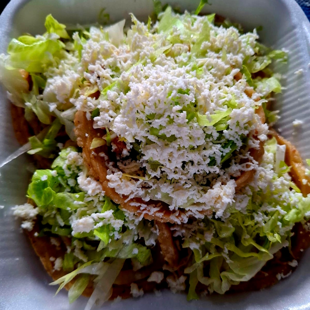 Acompañada con espaguetti, ensalada de lechua y 4 tortillas de masa