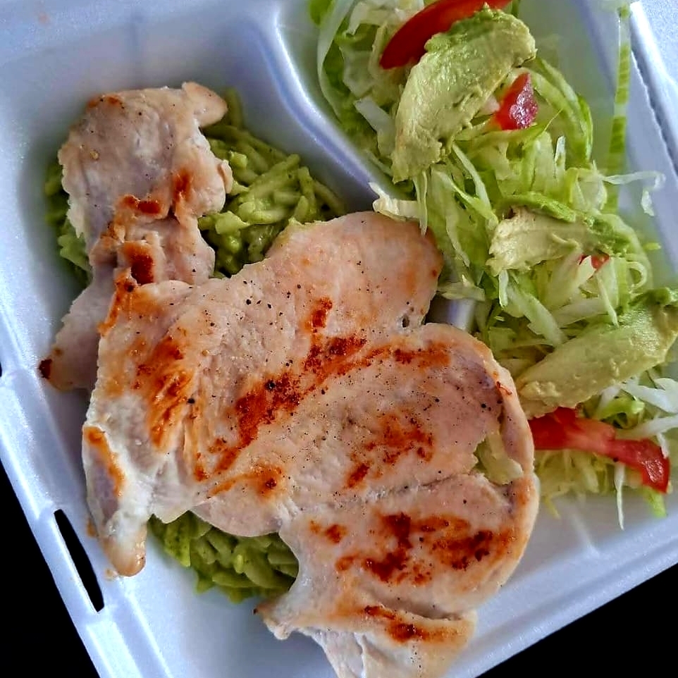 Milanesa de pollo a la plancha, acompañada de espaguetti, ensalada de lechuga y 4 tortillas de masa