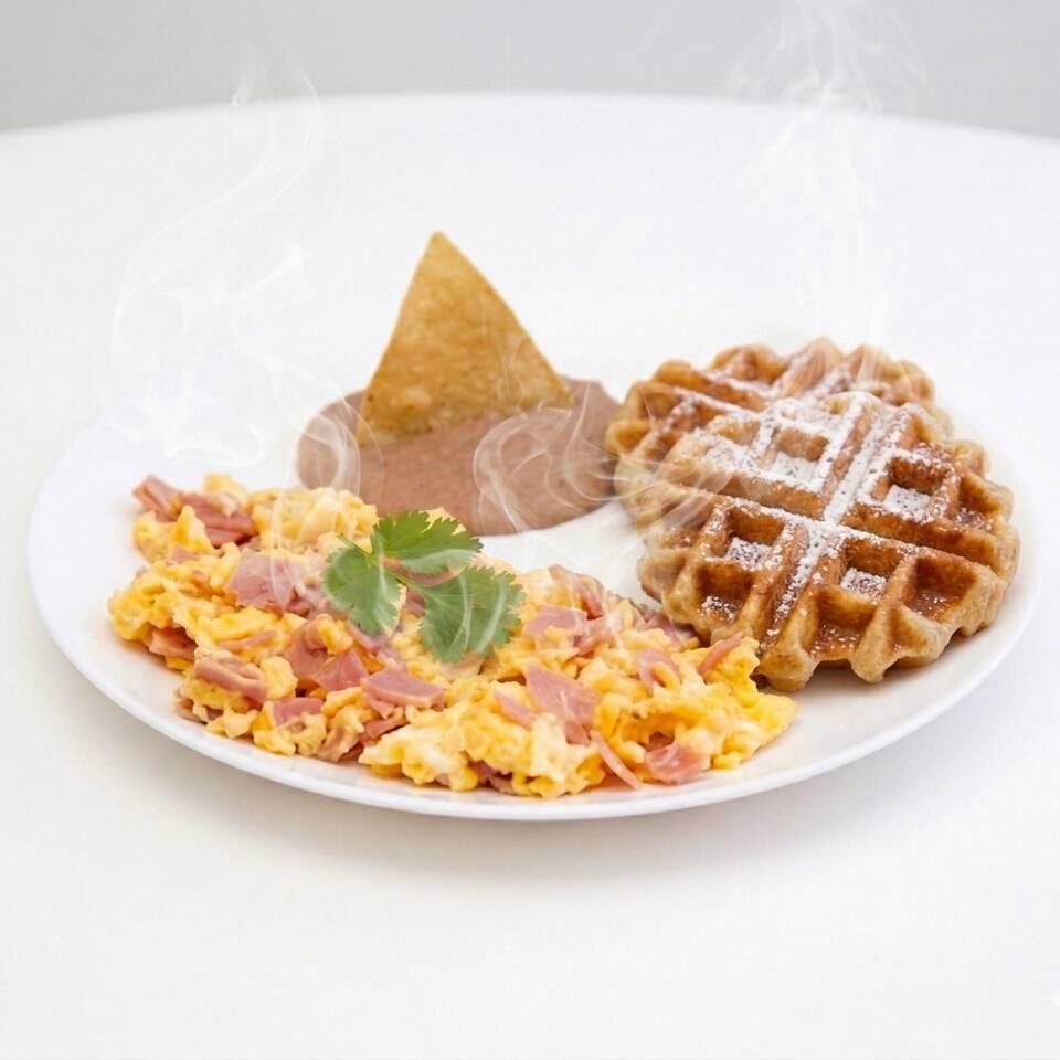 Huevos al gusto acompañado de frijoles y dos Waffles de la casa, ideal para empezar el dia!