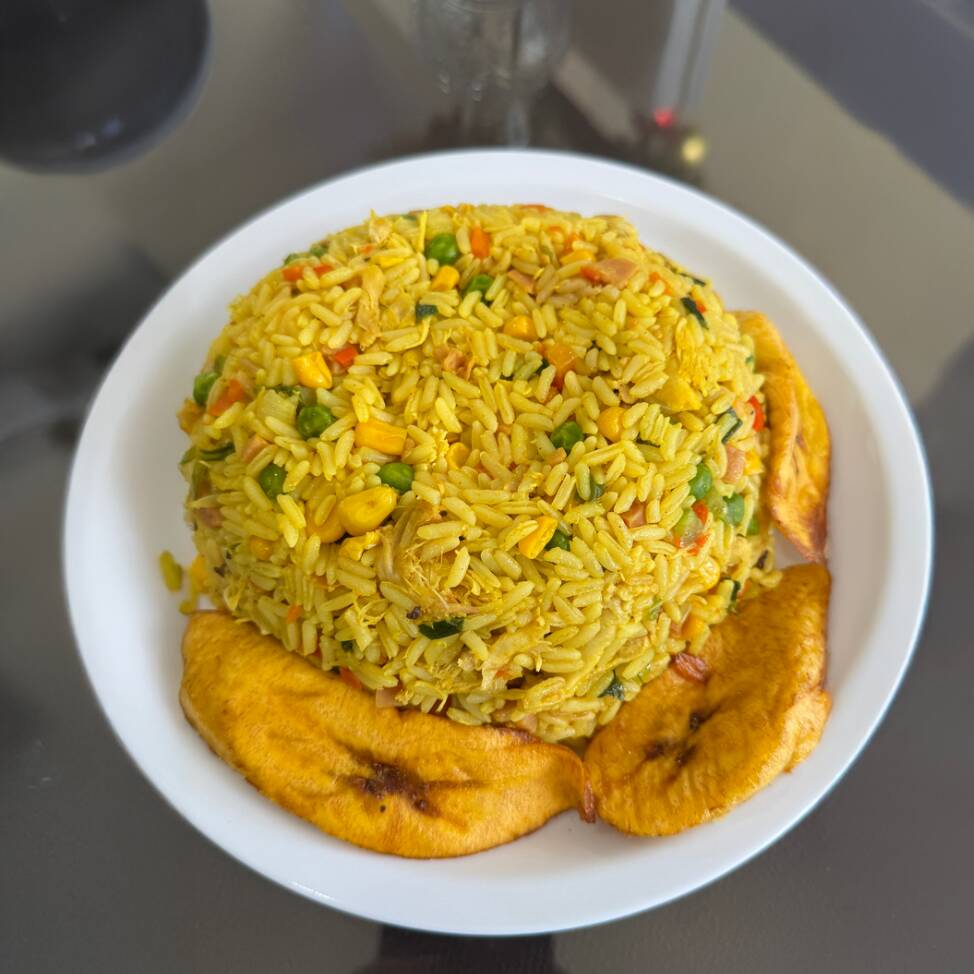 pollo cocinado con arroz, sofrito de verduras (cebolla, pimiento, ajo), y diversas especias como azafrán o comino, resultando en una comida sabrosa y reconfortante acompañado de tajadas