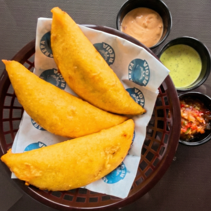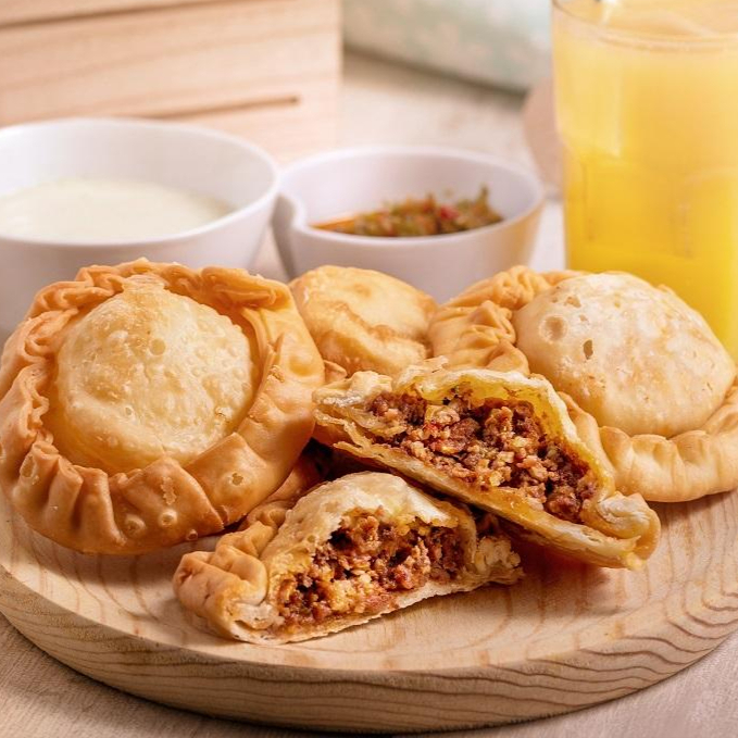 empanada pequeña y crujiente típica de los Andes venezolanos, hecha con una masa delgada de harina de trigo que se rellena tradicionalmente con una mezcla de carne molida, arroz cocido y huevo, o con queso, y se fríe hasta que está dorada y burbujeante