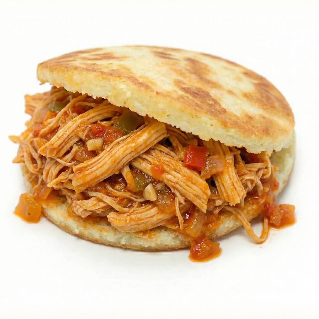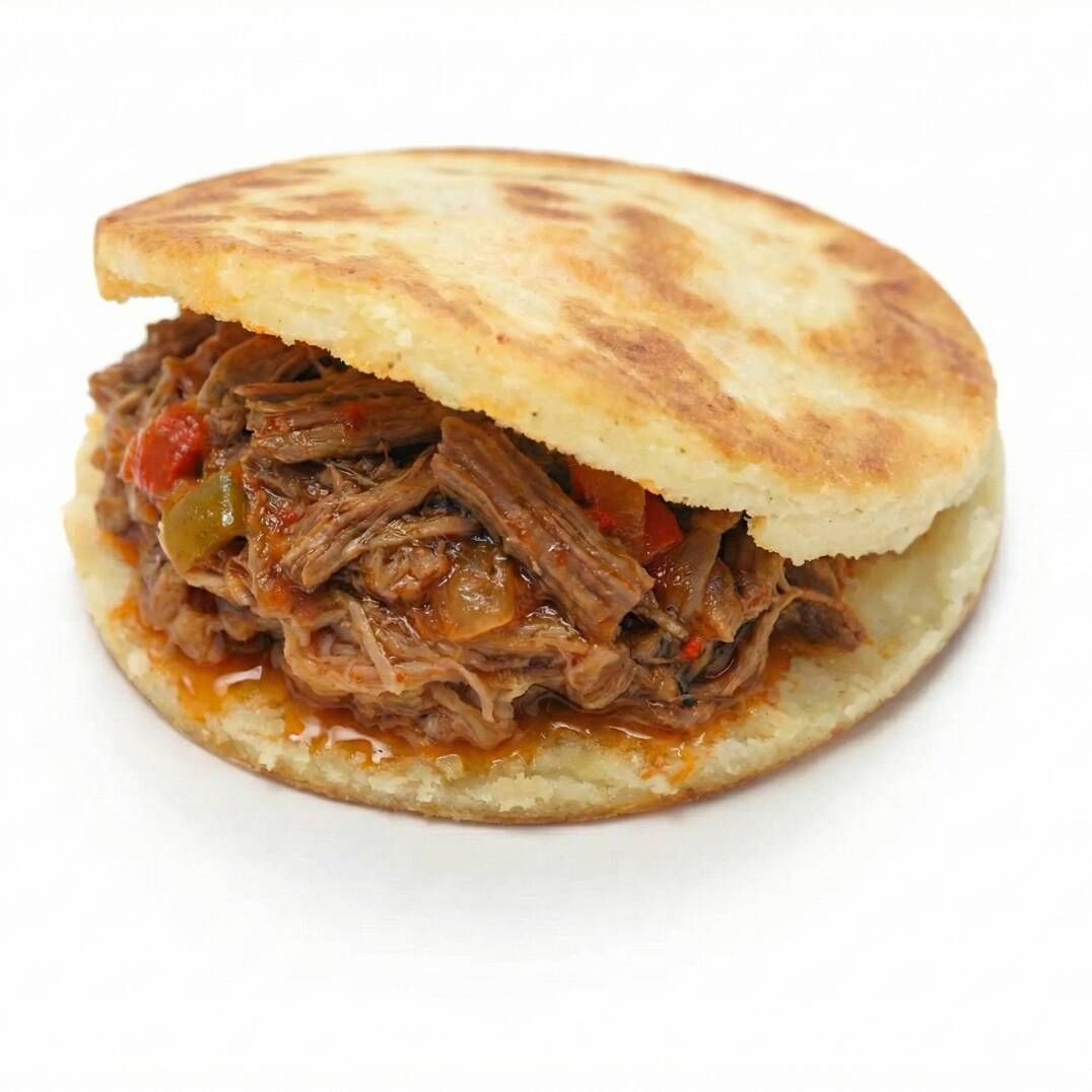 consiste en un disco crujiente de plátano verde frito y aplastado (patacón), que se rellena generosamente con carne desmechada o molida (preparada con sofrito de cebolla, pimentón y tomate), abundante queso rallado