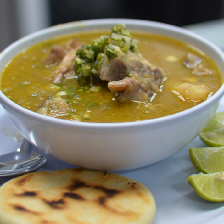 una sopa sustanciosa y nutritiva a base de trozos de carne de res (a menudo con hueso) hervidos lentamente con una variedad de tubérculos (yuca, ñame, ocumo, papa), vegetales (zanahoria, plátano verde, auyama, cilantro, cebollín) y un sofrito de aliños, resultando en un caldo espeso y reconfortante, servido con limón y acompañado a menudo de arepas