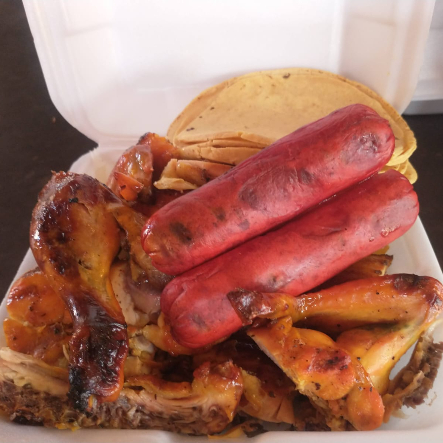 MEDIO POLLO ASADO AL ATAUD, COMO COMPLEMENTOS, SALSA, SALCHICHA, CEBOLLA, TORTILLAS, ARROZ Y CEBOLLA.