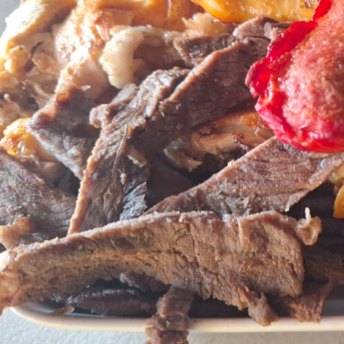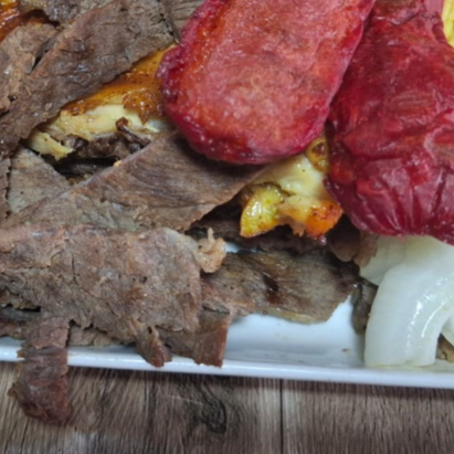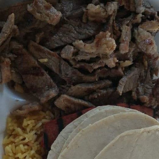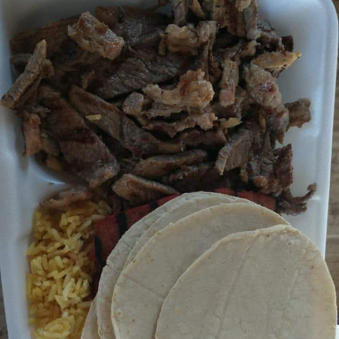 500G DE CARNE ASADA, TIPO BISTEC, COMO COMPLEMENTOS, SALSA, SALCHICHA, CEBOLLA, TORTILLAS, ARROZ Y CEBOLLA.