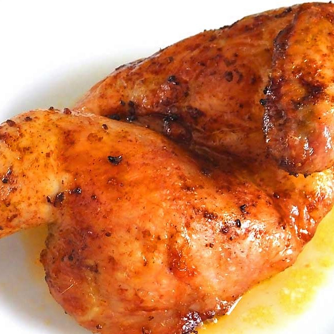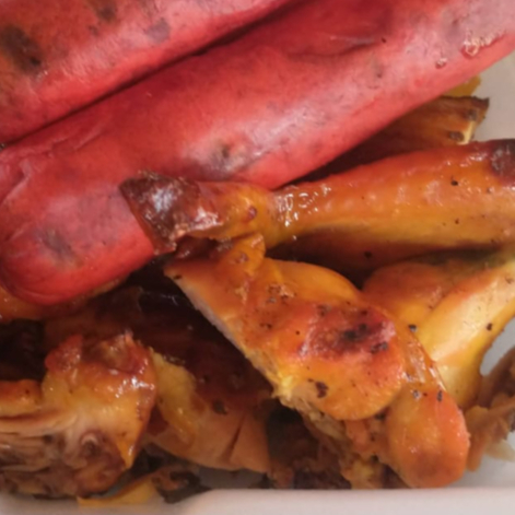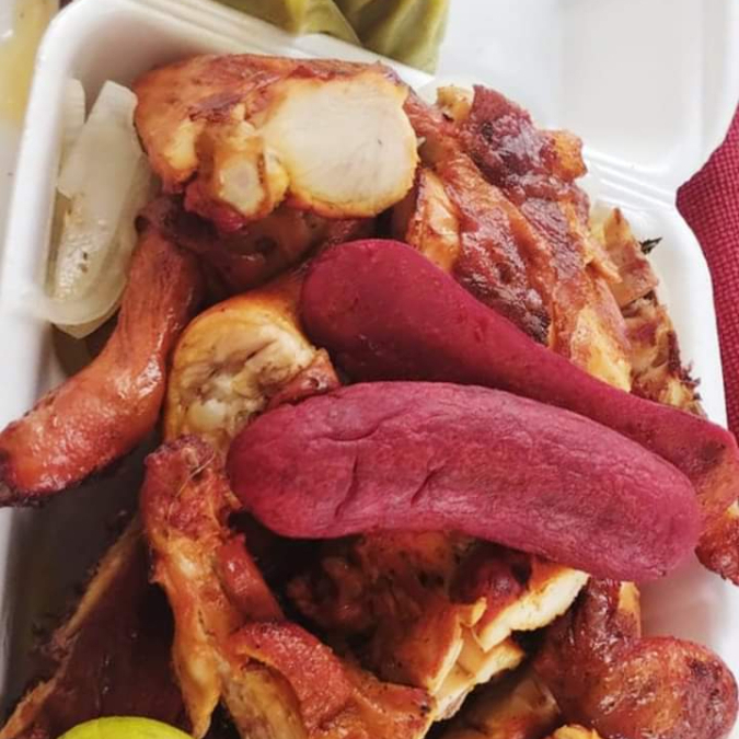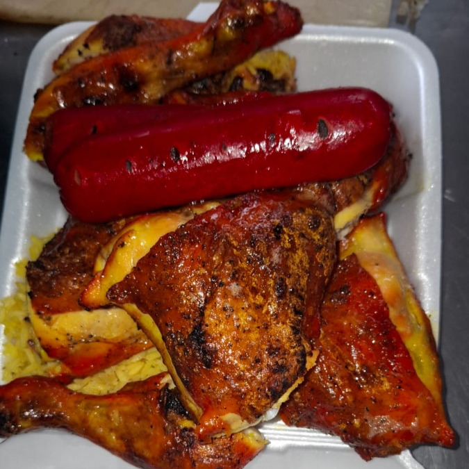 MEDIO POLLO ASADO BAÑADO EN SALSA HABANERA RECETA UNICA E INIGUALABLE, COMO COMPLEMENTOS, SALSA, SALCHICHA, CEBOLLA, TORTILLAS, ARROZ Y CEBOLLA.