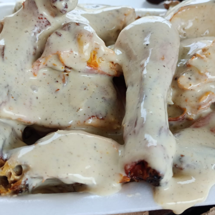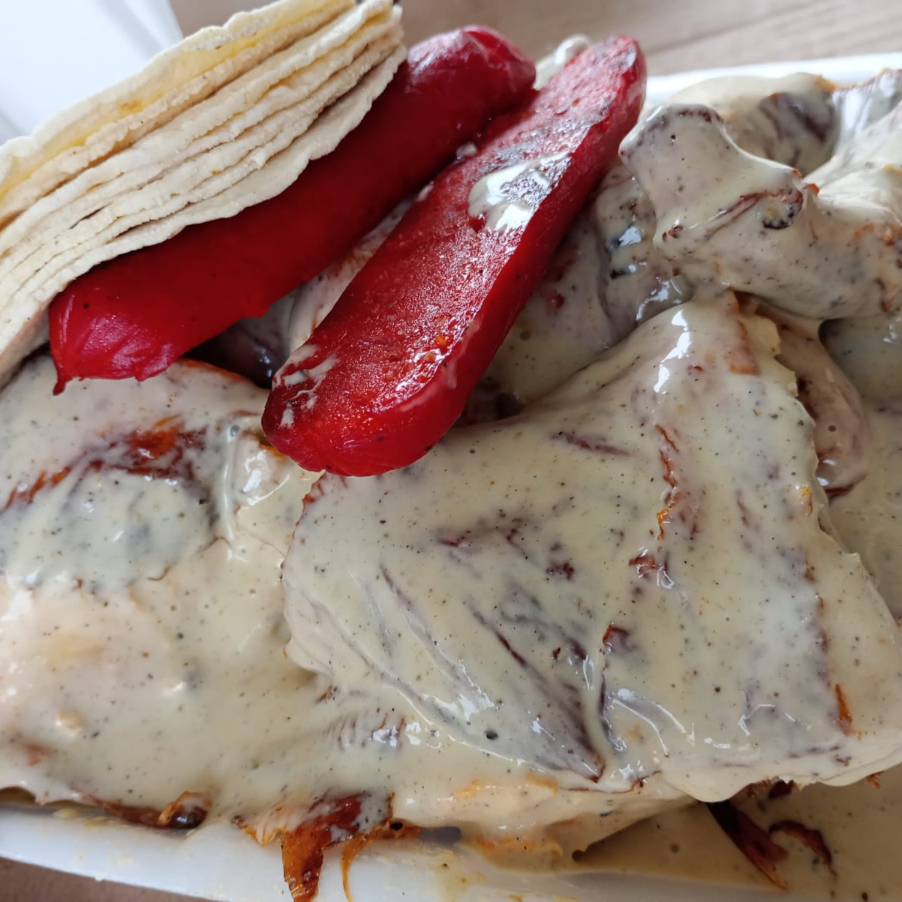 POLLO ASADO BAÑADO EN SALSA HABANERA RECETA UNICA E INIGUALABLE, COMO COMPLEMENTOS, SALSA, SALCHICHA, CEBOLLA, TORTILLAS, ARROZ Y CEBOLLA.