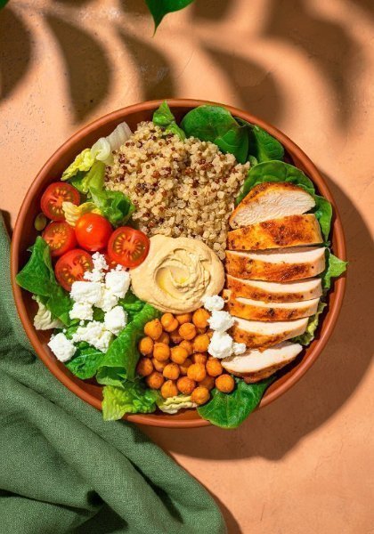 Bowl con base de quinoa, pollo a la plancha, espinaca fresca, queso de cabra, tomate cherry, pepino crujiente y hummus de garbanzo. Vinagreta recomendada: Libanesa