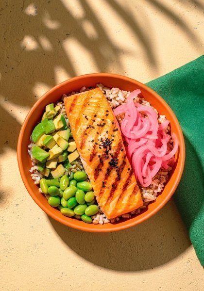Bowl con base de arroz integral, filete de salmón bañado en salsa oriental (120 g) y ajonjolí, edamames, aguacate cremoso y cebolla encurtida picante. Vinagreta recomendada: Oriental.