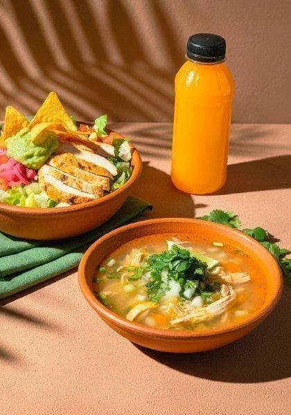 El combo incluye 1 Ensalada Mexicalia acompañadas de un consomé de pollo + bebida a elección.