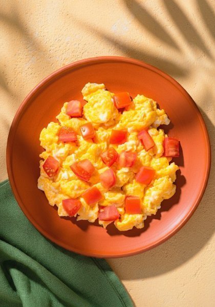 Huevos revueltos preparados a tu gusto, acompañados con tres ingredientes de tu elección para crear una combinación única y personalizada.