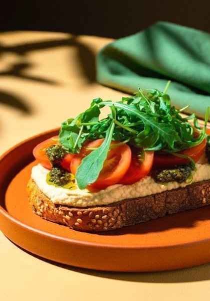 Tostada de pan de centeno con hummus, jitomate, arúgula y pesto. Apto para veganos.