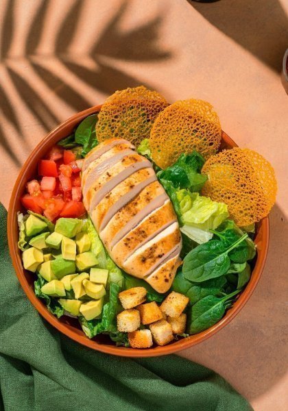 Ensalada a base de mix de lechugas frescas, pollo a la plancha con pesto, jitomate, aguacate, crutones, espinaca y 3 galletas de parmesano. Vinagreta recomendada: Cesar Yogur.