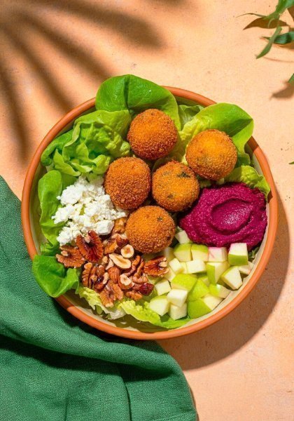 Ensalada con mix de lechugas frescas, albóndigas de berenjena (5 unidades), dip de betabel, queso de cabra, nuez caramelizada y manzana verde. Vinagreta recomendada: Oriental
