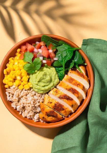 Bowl con base de arroz integral, pollo a la plancha con pesto, guacamole, espinaca, elote tierno, pico de gallo y cilantro. Vinagreta recomendada: Mediterránea.