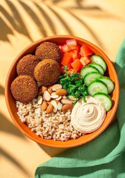 Bowl con base de arroz integral, almendras fileteadas, falafel crujiente (5 unidades), hummus de garbanzo, tomate fresco, pepino y perejil. Vinagreta recomendada: Libanesa.