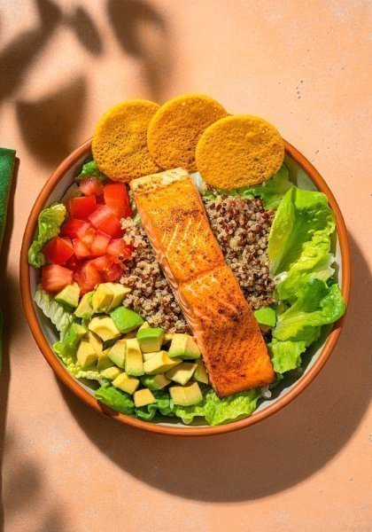 Ensalada a base de mix de lechugas frescas, quinoa especiada, filete de salmón (120 g), aguacate, jitomate y 3 crujientes galletas de parmesano. Vinagreta recomendada: Bálsamica.