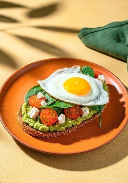 Exquisita tostada de aguacate sobre pan toscano con huevo frito, tomates cherry, espinaca y queso feta.