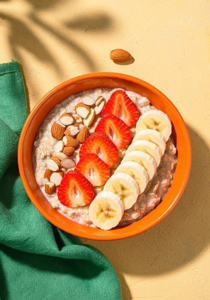 Bowl de avena preparada (canela, miel, chia,yogur) acompañado de fresas, rodajas de plátano y crujientes almendras. (180 gr.)