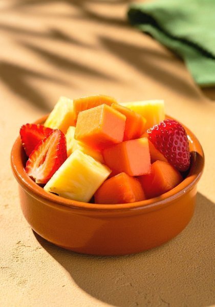 Porción fresca de fresa, papaya y piña, una combinación tropical y deliciosa para empezar tu día. (177 gr).