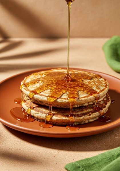 Deliciosos pancakes de avena, acompañados de dulce de jarabe de maple.