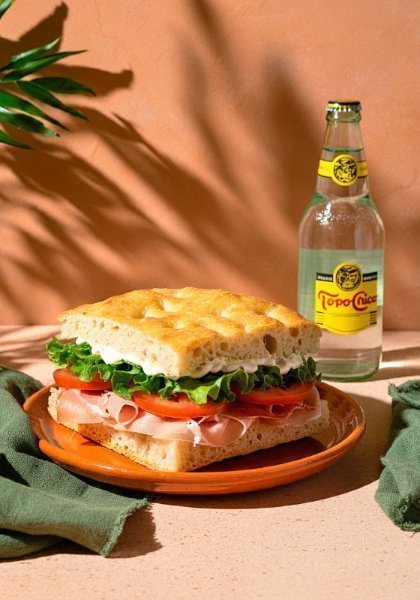 Escoge entre nuestras opciones de sándwiches hechos en pan focaccia de masa madre + una bebida Topo Chico Agua Mineral de 600 ml