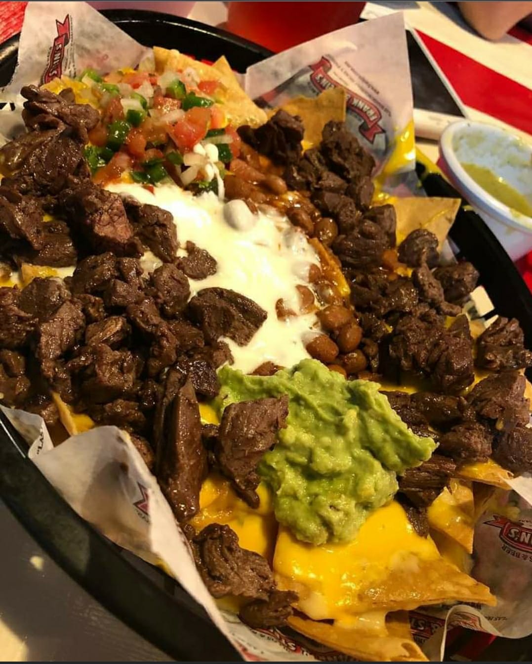 Papas francesas bañadas de queso amarillo, salsa alitas, tocino y carne asada.