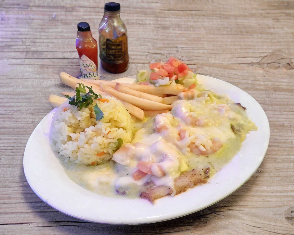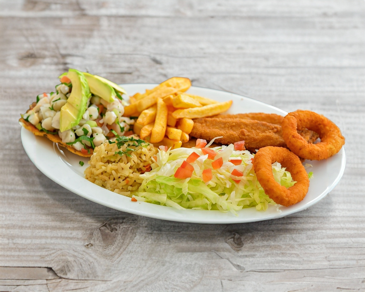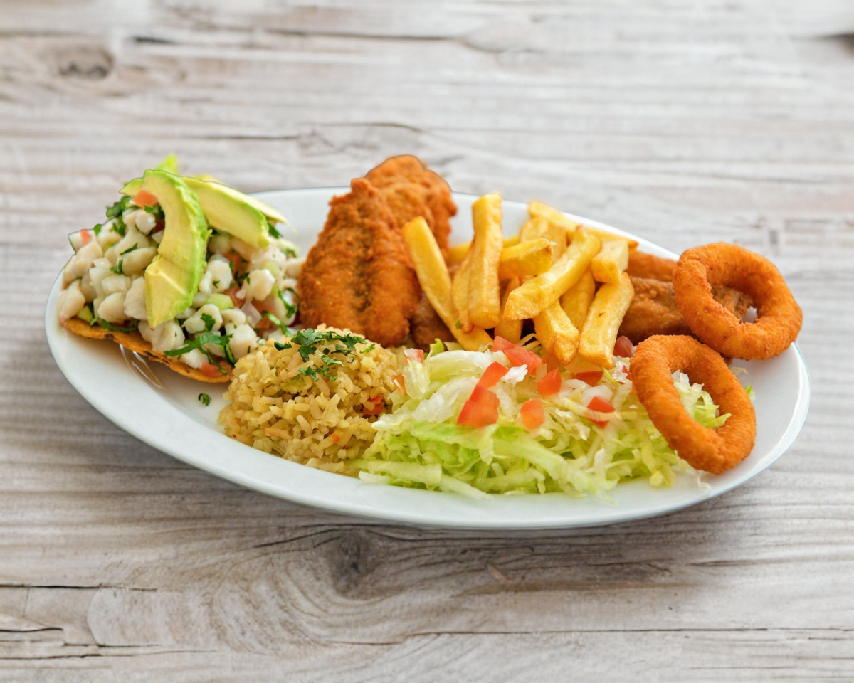 Filete empanizada, arroz (50 gramos ), papas a la francesa , ensalada ( lechuga y tomate en cuadros ), tostada de ceviche de pescado y camarones empanizados, salsas aparte