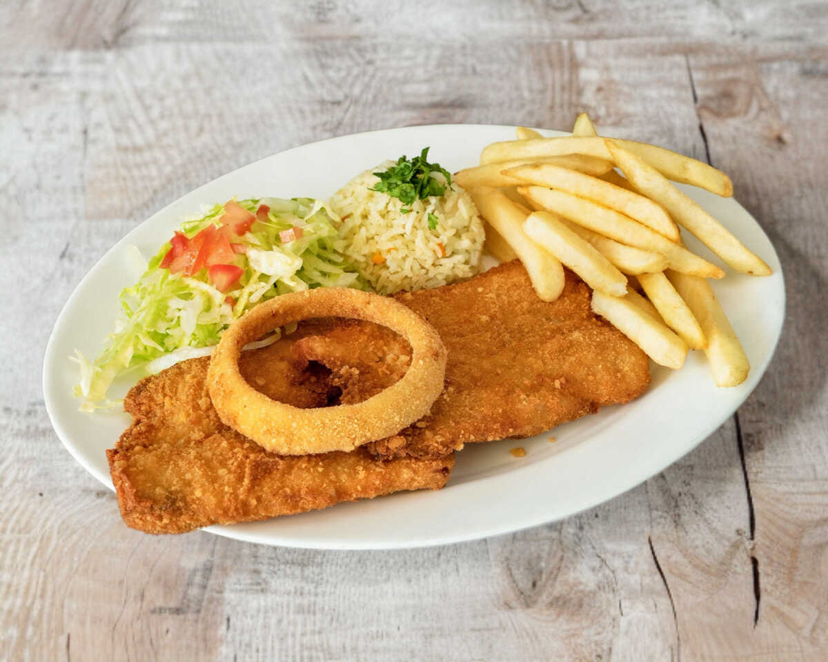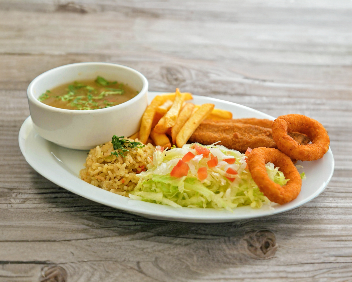 Filete empanizado, arroz, papas, ensalada con caldo de pescado